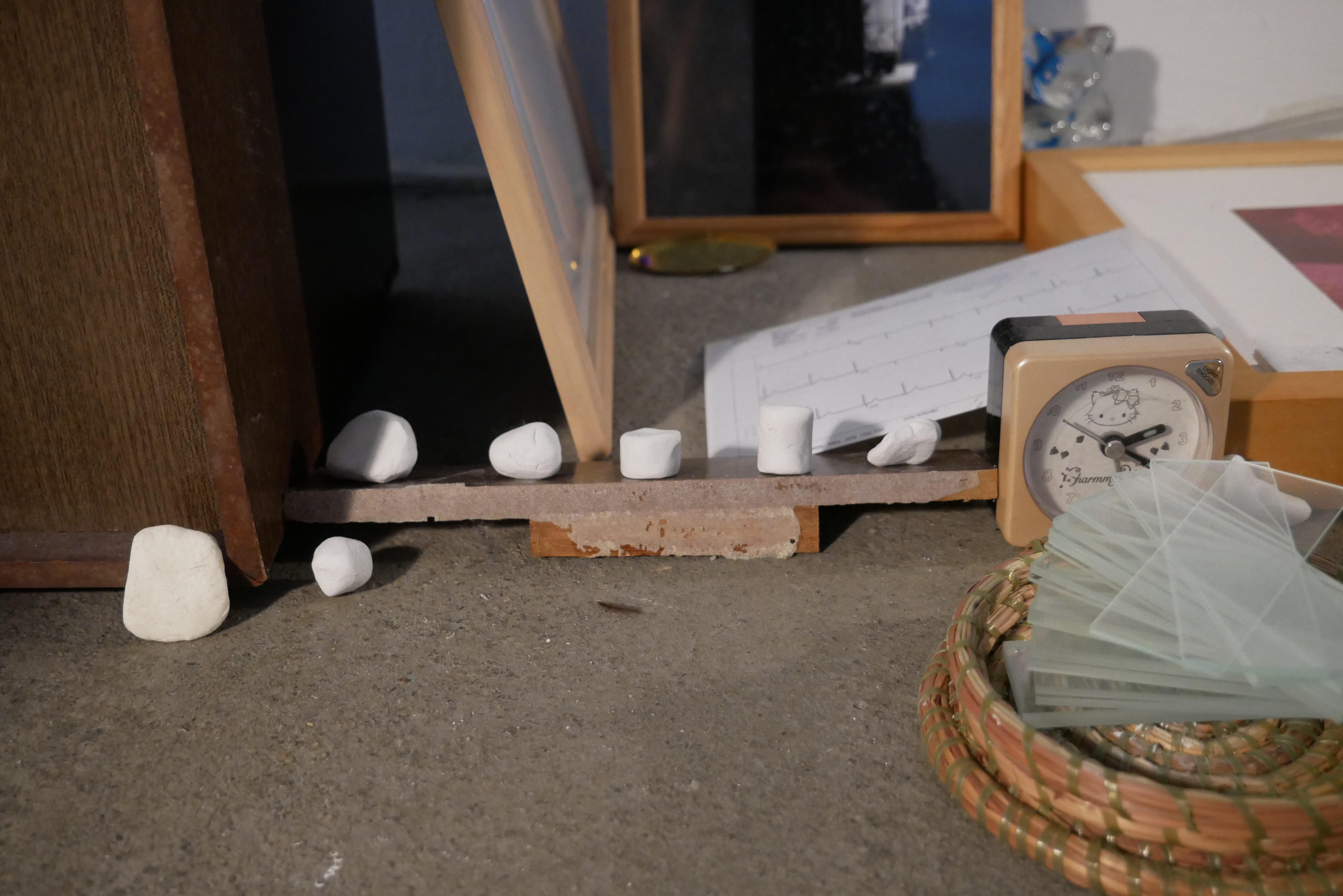조금 더 응시의 조도를 클로즈업으로 높이고 관람자의 몸이 아래로 굽혀지면, 이제는 두 작가의 실존적인 영역으로 어느덧 진입한다. 사물들은 저마다 작고 치명적인 사연들을 갖고 있게 마련이고, 그 상태에서 사연들이 다른 사연들과 잇고 나란하다. 숨은 이야기들을 듣게 된다면, 저 작은 금속액자는 왜 저런 성냥 한 개피가 액자구조의 턱에 놓여있는지, 아남TV의 추억을 가진 이에게 아남 라디오라는 비슷하면서도 생소한 기계가 어떻게 말을 거는지 등등에 신경이 쓰이기 시작할 것이다.